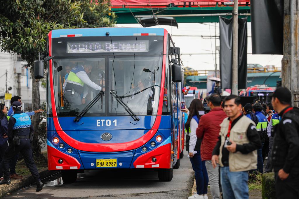 2025年3月31日,在厄瓜多尔首都基多,人们体验宇通双源无轨电车。新华社发(里卡多·兰德塔摄)