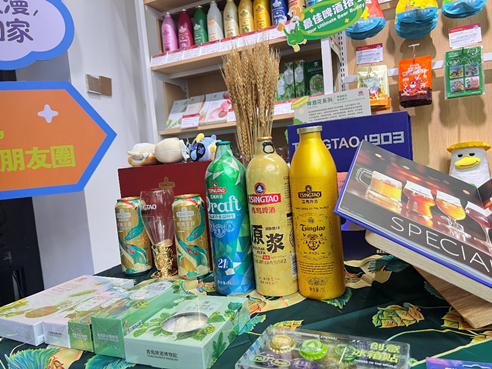 在青岛啤酒展区,诸多文创产品亮相进博会,为参展消费者提供了更多啤酒周边产品的购买及打卡体验。“啤酒味薯片有创意、有心意,我曾在青岛国际啤酒节现场吃到过,没想到在这里又遇见了。”一位参展消费者对啤酒味薯片、啤酒酵母饼干等“啤酒伴侣”系列情有独钟。还有哈酒鸭、“酣豆天团”等文创IP一一亮相,现场工作人员的热情介绍起“憨豆天团”:“这是我们打造的啤酒社交休闲零食品牌,最近辣炒蛤蜊味等青岛特色口味非常受欢迎。”